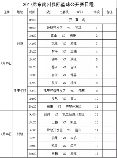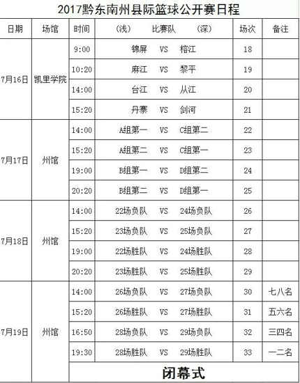 據(jù)悉,本次籃球公開賽為男子項目比賽,共15支隊伍參賽,均來自黔東南州。比賽時間從7月15日開始至7月19日結(jié)束,為期5天,共有 33場次的精彩比賽,比賽場地設(shè)在黔東南州民族體育館和凱里學(xué)院體育館。比賽設(shè)優(yōu)勝獎與組織獎,優(yōu)勝獎即按成績?nèi)∏鞍嗣謩e獎勵第一名168000元、第二名138000元、第三名98000元、第四至八名30000元;組織獎及第九名以后,獎金10000元。