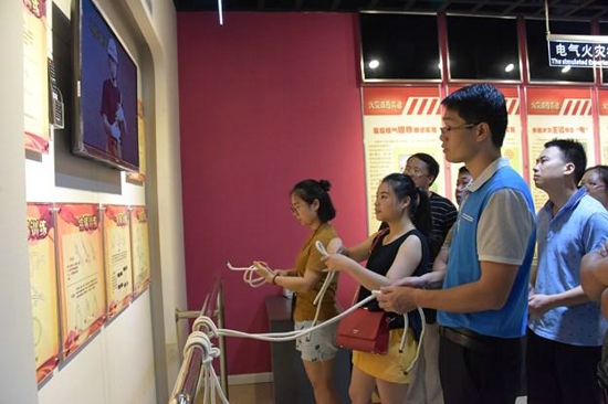 參觀過程中,參消防宣傳員詳細講解了火災的特點、日常用火、用電、用氣常識、初起火災撲救、如何正確地逃生自救以及正確報警等消防安全知識,并用通俗易懂的、貼近生活的語言為參觀人員講授了日常防火知識和消防法律法規,特別是在個人榮譽板塊,講述“親吻哥”何力的英勇救援事跡后,更是獲得了參觀人員的熱烈掌聲。在滅火體驗區,解說員講解滅火器的使用方法后,大家陸續使用滅火器向屏幕上的“大火”進行撲救,并掌握了滅火器的使用;隨后大家來到模擬煙霧逃生通道,在解說員的指導下,按照“低姿彎腰、捂住口鼻、沿著疏散指示標志”的正確方法模擬了一次火場逃生,并通過視頻回放,讓大家清楚認識到自己在逃生體驗中存在的誤區。緊接著,大家駐足在繩結教學區,邊觀看視頻解說,邊用配備的繩子動手操作。活動最后,職工對自己感興趣的區域再次進行參觀體驗。