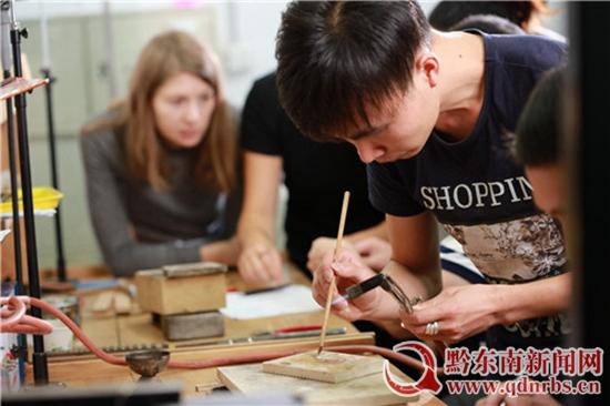 為了培養高素質技能技術人才,2017年6月,黔東南職業技術學院選派留在學校創業發展的“黔承世錦”團隊成員楊從森同學參加2017年文化部、教育部“中國非物質文化遺產傳承人群研修研習培訓計劃(苗族銀飾鍛造技藝研修班)”學習。研修學習期間,楊從森、楊平生、楊昌元、李秋燕4位來自黔東南的苗族銀飾鍛造技藝傳承人與荷蘭Blendix Design首飾設計師Moniek Vierling、Marit VanHeumen共同開展跨界合作。