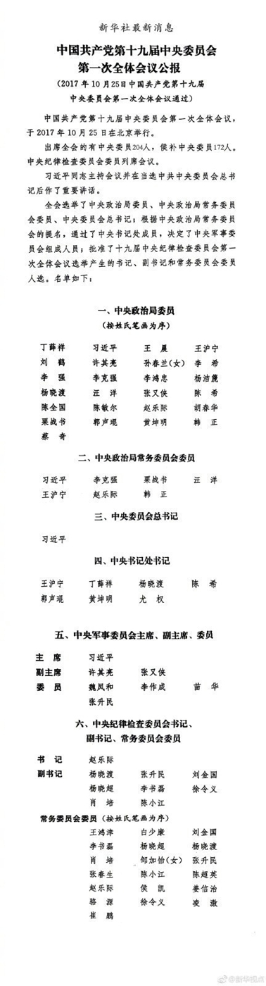 十九大新華社快訊:黨的十九屆一中全會選舉丁薛祥、習近平、王晨、王滬寧、劉鶴、許其亮、孫春蘭(女)、李希、李強、李克強、李鴻忠、楊潔篪、楊曉渡、汪洋、張又俠、陳希、陳全國、陳敏爾、趙樂際、胡春華、栗戰書、郭聲琨、黃坤明、韓正、蔡奇為中央政治局委員。