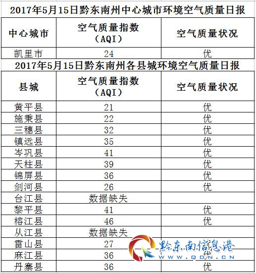 2017年5月16日黔東南州各縣(市)環境空氣質量日報