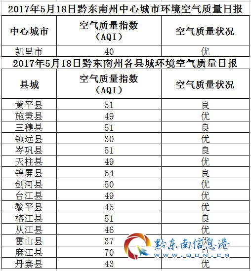 2017年5月19日黔東南州各縣(市)環(huán)境空氣質(zhì)量日報