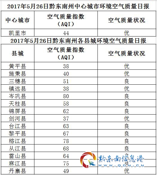 2017年5月31日黔東南州各縣(市)環境空氣質量日報