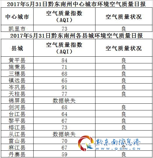 2017年6月1日黔東南州各縣(市)環境空氣質量日報