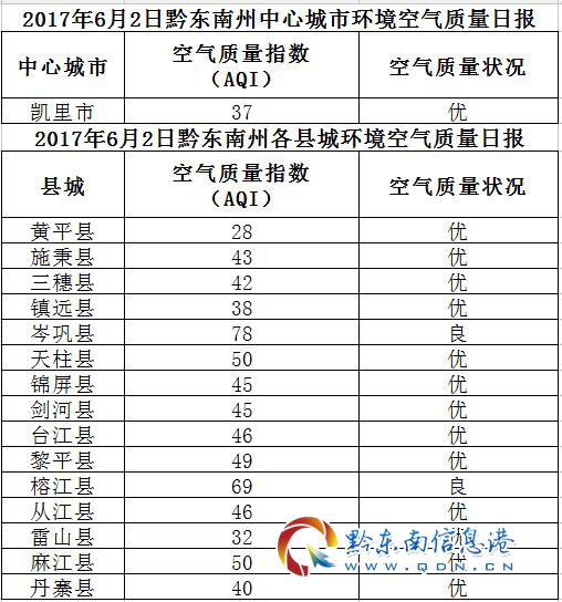 2017年6月3日黔東南州各縣(市)環(huán)境空氣質(zhì)量日?qǐng)?bào)