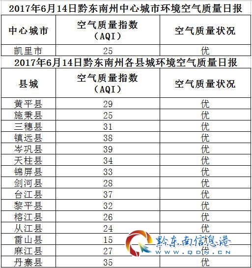 2017年6月15日黔東南州各縣(市)環(huán)境空氣質(zhì)量日報