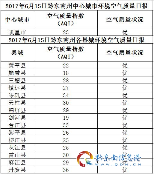 2017年6月16日黔東南州各縣(市)環境空氣質量日報