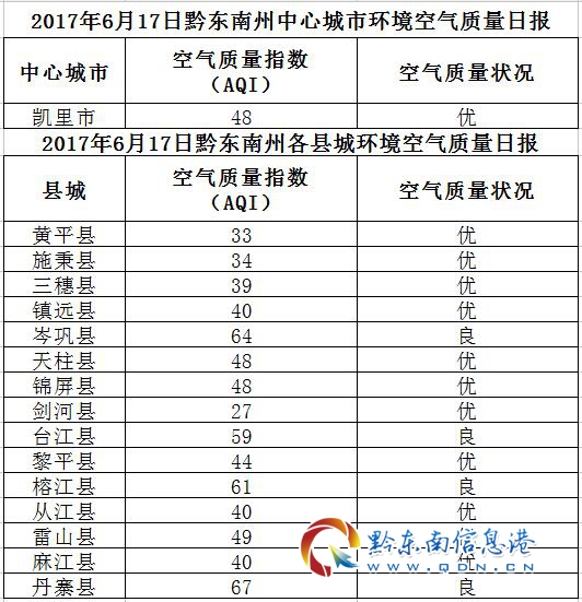 2017年6月18日黔東南州各縣(市)環境空氣質量日報