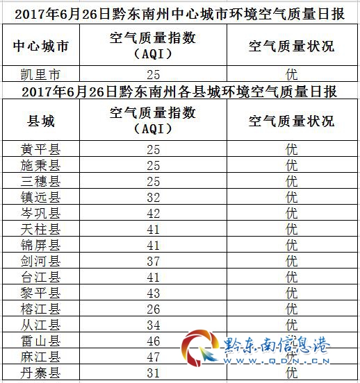 2017年6月27日黔東南州各縣(市)環境空氣質量日報