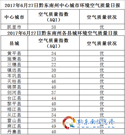 2017年6月28日黔東南州各縣(市)環境空氣質量日報