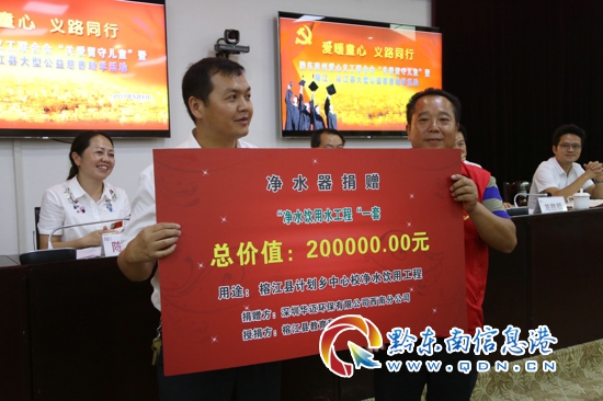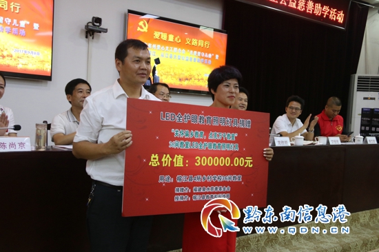 據了解,此次公益活動黔東南州愛心義工聯合會為榕江縣218余名精準扶貧貧困家庭、“留守兒童”中適齡兒童按小學1200元,初中、高中1800元的標準進行現場愛心幫扶,現金32.4萬元。福建泉水慈善基金會為榕江縣和平小學、加宜小學、太平小學、崇義中學等4所鄉村學校36間教室捐贈256盞立達信LED全護眼教育照明燈具,總價值30萬元;對從江縣山區學校現場捐獻40間教室捐贈立達信LED全護眼教育照明燈具,總價值34萬元,合計現場捐贈64萬元。深圳華邁環保公司為榕江縣、從江縣農村敬老院、學校、精準扶貧對象戶及鄉鎮單位食堂捐獻“華邁HMU-VI型”凈水器總計104臺,總價值28萬元;為榕江縣計劃鄉小學捐贈校園凈水系統1套,價值20萬元;為榕江縣民政局捐贈凈水器16臺,價值4.1萬元,合計現場捐贈52萬元。