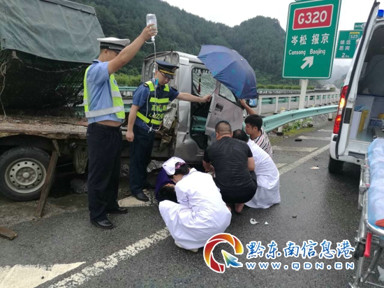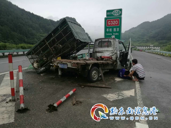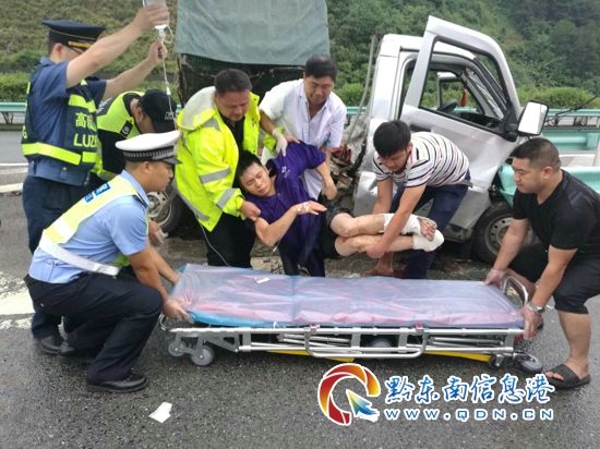 當日上午10點左右天空正下著雨,黔東南州公安局交警支隊高速三穗大隊劍河中隊民警接到報警稱在岑松匝道發生一起交通事故有人受傷,民警接警后第一時間趕到現場后看到,一輛小型貨車碰撞高速公路匝道與行車道隔離的護欄上,車體已經嚴重變形,車廂被甩在一邊,乘車人員腳受傷,黔東南州公安局交警支隊高速三穗大隊劍河中隊協警龔金城跟同事維護好現場的秩序后,自己連忙跑到被困貨車旁幫忙施救。