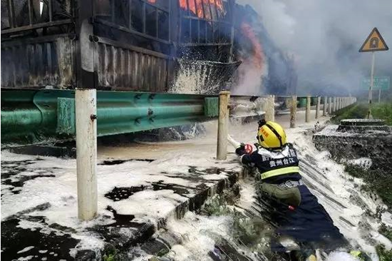 6月24日10時許,滬昆高速公路凱里至臺江方向K1648+800下行線,一輛滿載貨物的掛車突發大火,火勢呈蔓延趨勢,情況十分緊急。經過消防官兵20分鐘的撲救,成功將火勢控制。