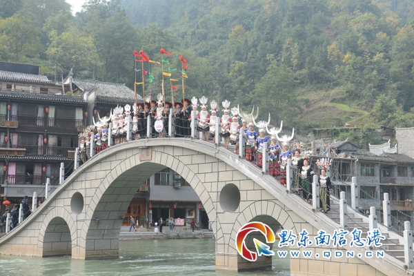 29日上午,參加展演巡游的隊伍從天下鳳凰大酒店前的廣場出發,長長的展演巡游隊伍蜿蜒近一公里,經南華門—S型金水橋—老營哨—跳巖—北門—東門—虹橋—沙灣—云橋等景區,其中S型金水橋、跳巖、沙灣萬壽宮、鳳凰記憶四個地點為服裝秀表演地點。臺江苗族代表隊的30位苗族姑娘走在巡游隊伍的最后。各地苗族的銀飾服飾各具特色,多姿多彩,爭奇斗艷,但最亮麗的應該還是臺江苗族銀飾服飾。生活在臺江的苗族被稱為熠熠銀光包裹著的民族,銀飾在苗族服飾中占有極為重要的地位。在漫長的歷史發展中,臺江苗族形成獨特的銀飾服飾文化,不僅品種多樣,且造型奇美,以華麗、繁復的裝飾與深刻的文化內涵著稱于世。臺江苗族姑娘伴隨著蘆笙、芒筒的歡快樂曲,穿行在鳳凰古城的街巷里,所到之處,無不成為游客矚目的焦點。道路兩邊擠滿了觀看的游客,他們紛紛拿起手里的相機或手機拍照,更有大膽者竟跑進臺江苗族姑娘隊伍,摟起苗族阿妹的肩,合影留念。每到金水橋、跳巖、沙灣萬壽宮、鳳凰記憶等景點,臺江苗族姑娘周邊則聚集了大批長槍短炮,他們是參加第三屆鳳凰民俗攝影雙年展的攝影家們。這景、這人,是他們鏡頭里絕佳的對焦點。“太美了,太漂亮了!”人群中發出陣陣驚嘆,時不時引起一陣陣騷動。從整個展演巡游過程看,最吸引游客眼球的應該是臺江苗族代表隊,仿佛這鳳凰古城就是一座展示臺江苗族姑娘風采的T臺,沱江兩岸的風光成為最美麗的背景,她們就是今天最耀眼的明星。姑娘們高興地唱起了苗族飛歌……。臺江故事,鳳凰傳奇!歌聲、照相機快門聲、銀飾叮咚聲、游客的喝彩聲,交織出鳳凰的盛世歡歌。