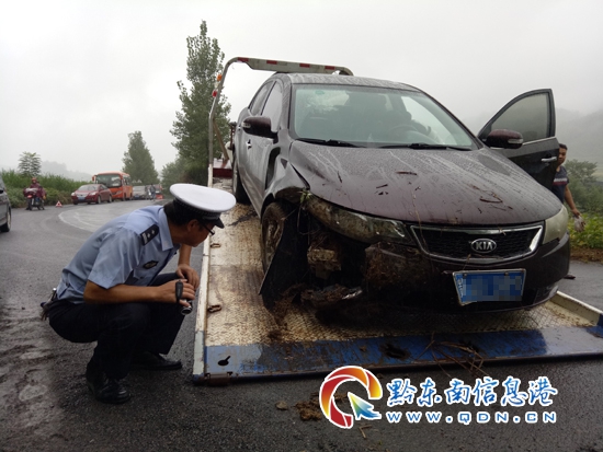據現場了解,駕駛員已持C1駕駛證有3年,自己的車,也經常駕車,技術還可以。今天是因為有急事就早早的去30公里外的白市鎮辦事,事情辦好后又忙著趕回去上班。在從白市鎮往天柱方向行經社學鄉紅衛村轉彎路段時,因天上下著毛毛細雨,公路上的路面又布滿有松散的砂石,速度又有點過快,剎車時已不起作用,車輛失控,直接撞向路邊路坎。據駕駛員講當時的速度估計有60碼左右,因沒有受傷,她自己也感到慶幸,車子損毀是小事,自己沒有受傷是萬幸了。她說今天出事是有預兆的,民警也親和的告訴她不能怪做夢不好,這個事故的主要原因是下雨天轉彎速度過快而造成的。