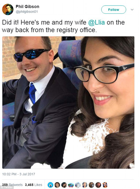 三年前,莉亞在推特上寫道:“你是個男的嗎?你能在下周的一場婚禮上陪我一天嗎?如果你能帶來一個孩子,我可以假裝她(他)是我的。”隨后菲爾回復了她,但他們并沒有一同參加莉亞姐姐的婚禮,而是在幾天后見面約會。