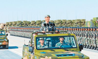 7月30日上午,慶祝中國人民解放軍建軍90周年閱兵在朱日和聯合訓練基地隆重舉行。中共中央總書記、國家主席、中央軍委主席習近平檢閱部隊并發表重要講話。這是習近平乘車檢閱部隊。新華社記者 李 剛攝