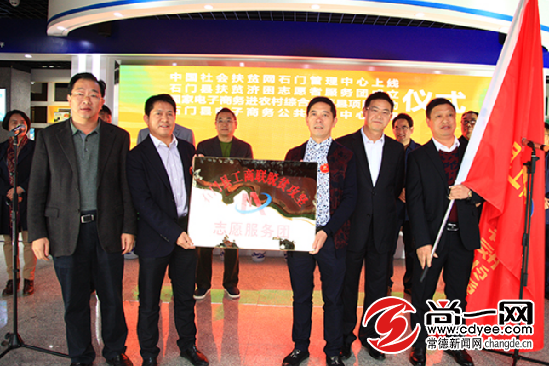 常德市人大常委會副主任、石門縣委書記譚本仲,石門縣委副書記、石門縣人民政府縣長郭碧勛為石門縣扶貧濟困志愿者服務團授旗、授牌。尚一網記者 裴維維 攝