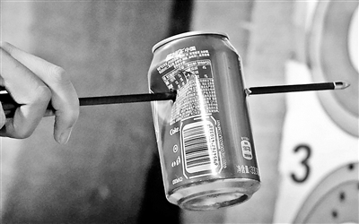 使用彈弓所附帶的弓箭進(jìn)行試驗(yàn)發(fā)現(xiàn),在10米的距離,箭頭可沒入靶子約3厘米深。距離3米處,則可射穿易拉罐瓶。