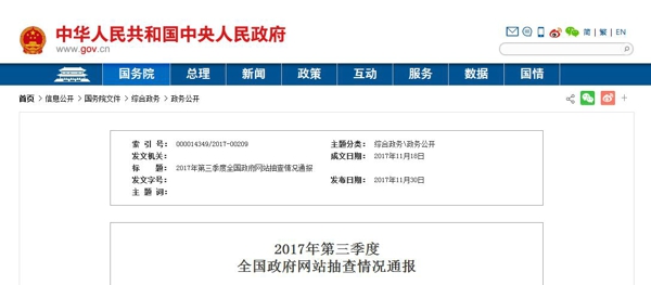 央視網消息:國務院辦公廳政府信息與政務公開辦公室近期組織開展了2017年第三季度全國政府網站抽查。現將有關情況通報如下: