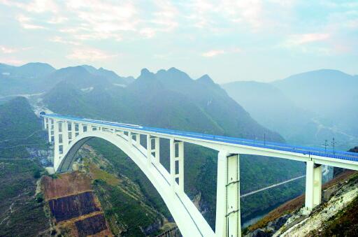12月20日,動車組在世界最大跨度的鋼筋混凝土拱橋——滬昆高鐵北盤江大橋上試運行。