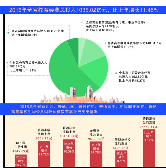 2016年,我省教育經費總投入達1035.02億元,比上年增長11.45%。其中,國家財政性教育經費(主要包括公共財政預算安排的教育經費,政府性基金預算安排的教育經費,企業辦學中的企業撥款,校辦產業和社會服務收入用于教育的經費等)達892.42億元,比上年增長10.87%,占教育總投入的86.22%。