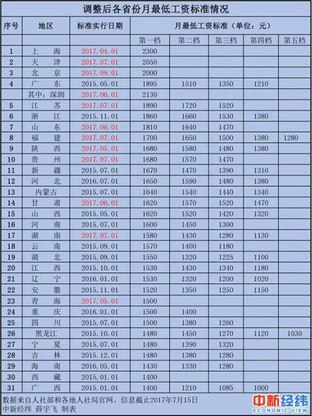 2017年已經過半,全國多個省市已經上調了今年的最低工資標準。統計發現,截至7月15日,上海、天津、江蘇、山東等11個省市及廣東深圳上調了最低工資標準,其中,北京將在今年9月調整到位。數據顯示,地方政府上調最低工資的步伐有所放慢,漲幅已經出現回落。