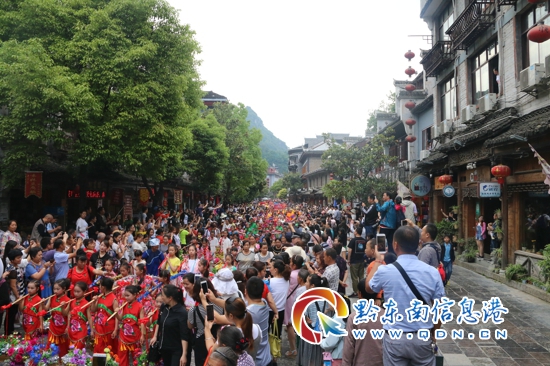 清晨中的鎮(zhèn)遠(yuǎn)古城被舞陽河上節(jié)奏明快的鼓聲叫醒,大街小巷擠滿了來自四面八方的游客以及鎮(zhèn)遠(yuǎn)當(dāng)?shù)氐娜罕娗皝�,大家不約而同的往青龍洞方向聚攏,端午狂歡即將上演。