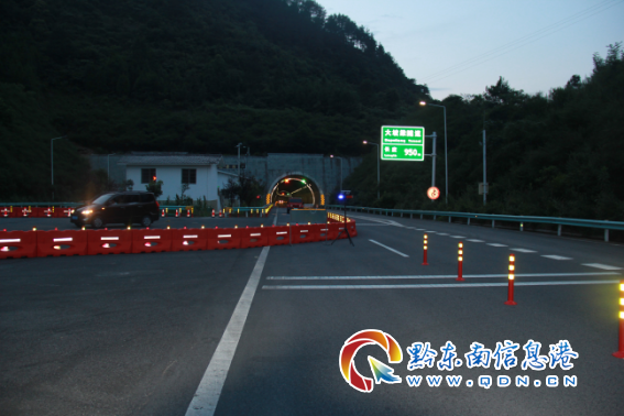 銅仁營運中心考慮到新一輪強降雨即將來臨,以及治理隧道隱患所需時間較長。為保障道路通暢,決定在該路段組織實施單幅雙向通行。7月2日,高速“一路三方”相關部門針對該路段實施單幅雙向通行的交通組織進行現場查勘,決定利用隧道進出口的中央隔離活動區作為借道通行接口,鎮遠往劍河方向自122KM處開始渠化,封閉行車道,超車道半幅通行;劍河往鎮遠方向自130KM處開始渠化,封閉超車道,行車道半幅通行,大坡粱隧道內(124KM至125KM)借道雙向通行。7月3日19時,借道通行所需交通設備已全部設置完畢,該路段開始實施借道通行。待隧道隱患全部治理完畢后恢復正常通行。