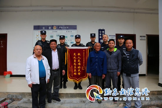 本網訊 11月7日上午,鎮遠縣舞陽鎮朝陽壩胡吉忠老人帶著其家人來到縣公安局特巡警大隊,送上一面印有“見義勇為真英雄,救人危難好民警”字樣的錦旗,感謝日前救助他老伴的鎮遠公安四位特巡警隊員。