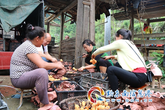 本網訊 5月2日,筆者在從江縣下江鎮萬畝林場果樹種植基地看到,該基地負責人吳文祥愛人及子女正在裁剪已成熟的枇杷裝框,黃櫈櫈的枇杷透露著一股誘人的清香,簡直讓人垂涎欲滴。