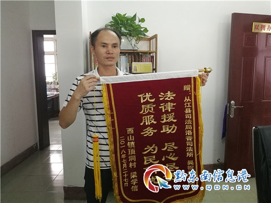 這面印著“法律援助 盡心盡責(zé) 優(yōu)質(zhì)服務(wù) 為民解憂”的錦旗不僅承載著群眾對法律援助工作的認可,同時也是一種鞭策。從江縣法律援助中心及各司法所始終以法律面前人人平等原則,圍繞“化解社會矛盾,服務(wù)民生促和諧”這一目標(biāo),堅持“應(yīng)援盡援,應(yīng)援優(yōu)援”的理念,使社會弱勢群體的合法權(quán)益得到保障,消除他們因“家庭經(jīng)濟困難,維權(quán)無門”的思想顧慮。開通了農(nóng)民工援助綠色通道,切實維護農(nóng)民工合法權(quán)益,把法律援助惠民工程落到實處。(從江縣司法局 吳祝江)