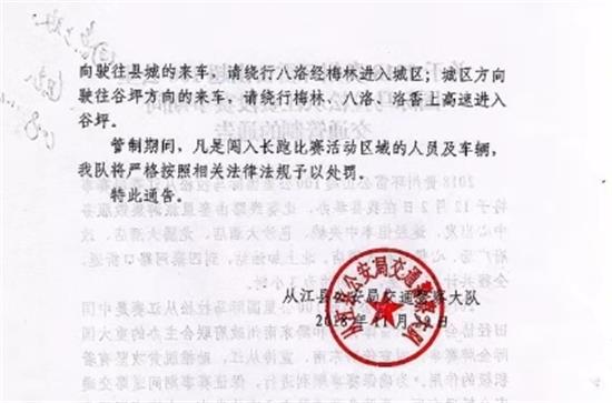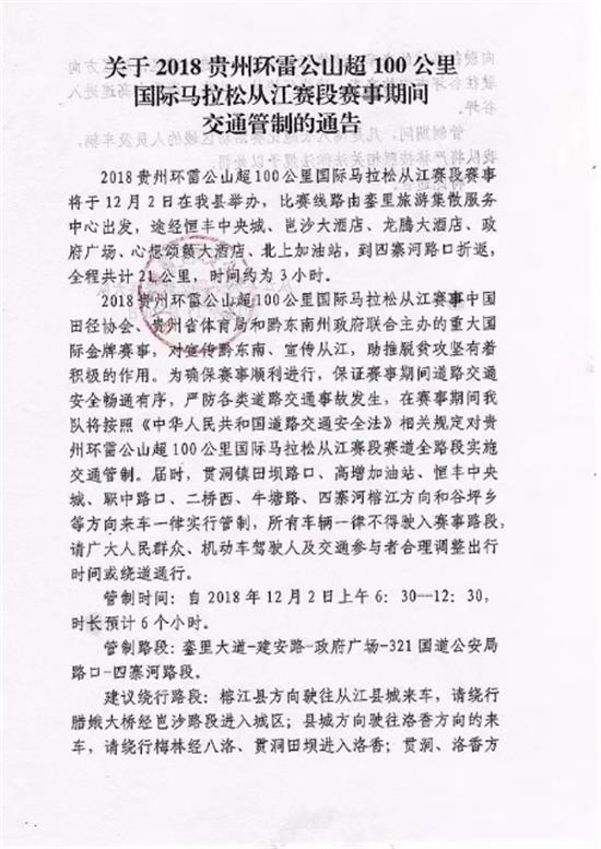 對此,從江縣公安局交通警察大隊也發布了《2018貴州環雷公山超100公里國際馬拉松從江段賽事期間交通管制的公告》,《公告》顯示本次賽事交通管制路段為鑾里大道-建安路-政府廣場-321國道公安局路口-四寨河路段。