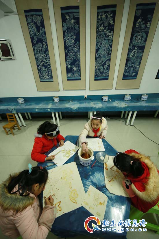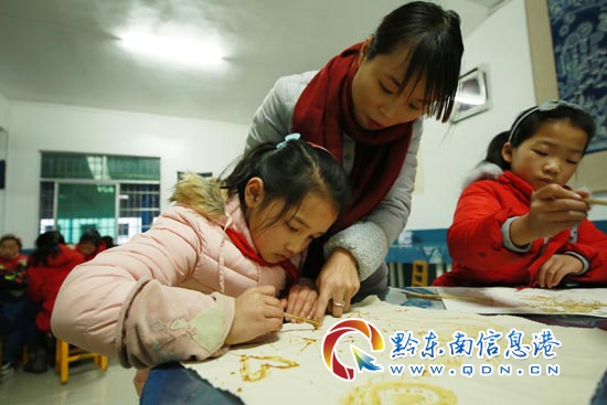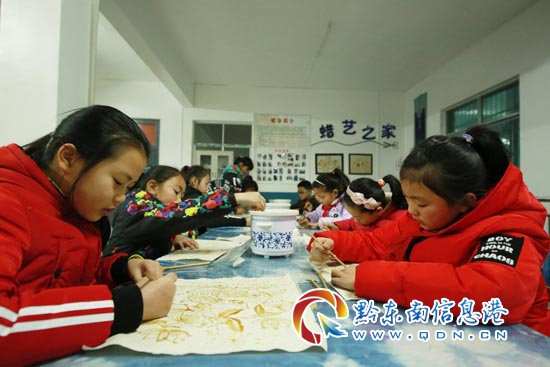 1月3日,在丹寨縣城關第一小學少年宮,蠟染興趣班的學生在學習蠟畫