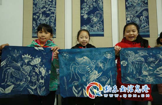 1月3日,在丹寨縣城關第一小學少年宮,蠟染興趣班的學生展示自己的蠟染作品