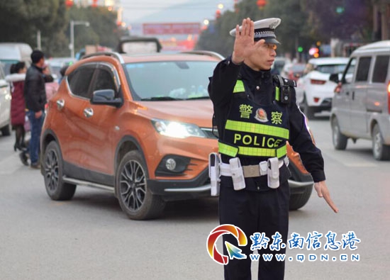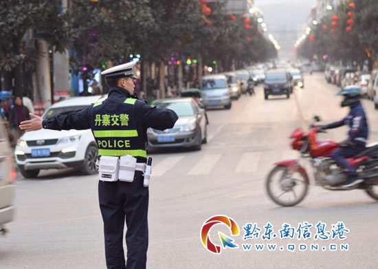 為避免交通擁堵,方便群眾出行,置辦年貨,丹寨縣交警大隊組織警力在城區主要街道加大巡邏力度,對人流量較大的街道采取臨時交通管制,并安排警力管控紅綠燈十字路口,指揮車輛有序通行。(陸德華 攝)