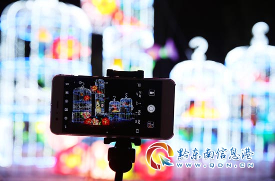 2月27日晚,在丹寨縣萬達小鎮景區,游客用手機拍攝彩燈。