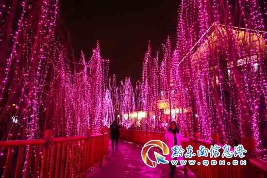 2月27日晚,在丹寨縣萬達小鎮景區,游客在彩燈下自拍。