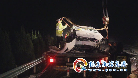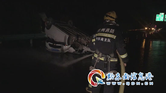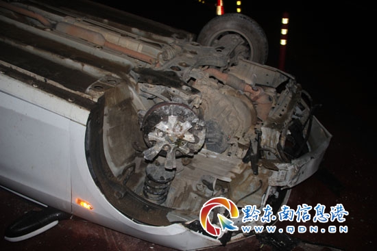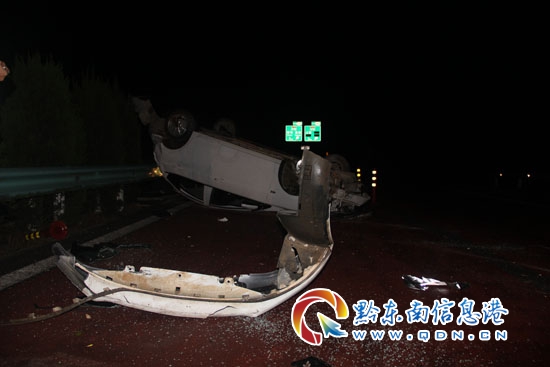 當(dāng)晚,19時50分左右,黔東南州公安局交警支隊高速一大隊民警接到報警電話稱“在余安高速140km+500m處(丹寨縣高要村附近),有一輛轎車仰翻在高速公路上,車上情況不詳。”