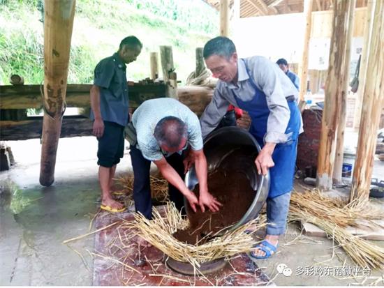炒好的菜籽在碾坊碾碎。古法榨油工藝復雜,磨碎的菜籽必須再經蒸汽熏蒸。用稻草墊底將蒸好的菜籽填入圓形的鐵箍之中,做成胚餅。胚餅裝入榨槽后就可以開榨了。打榨是出油的最后一道程序,近百公斤的撞錘,敲打木楔,反復打榨,一滴滴晶瑩透亮的菜籽油便從榨膛里緩緩流出。經過千錘萬擊出來的菜籽油,油質純正、顏色鮮亮、口感香潤,特別的營養健康。