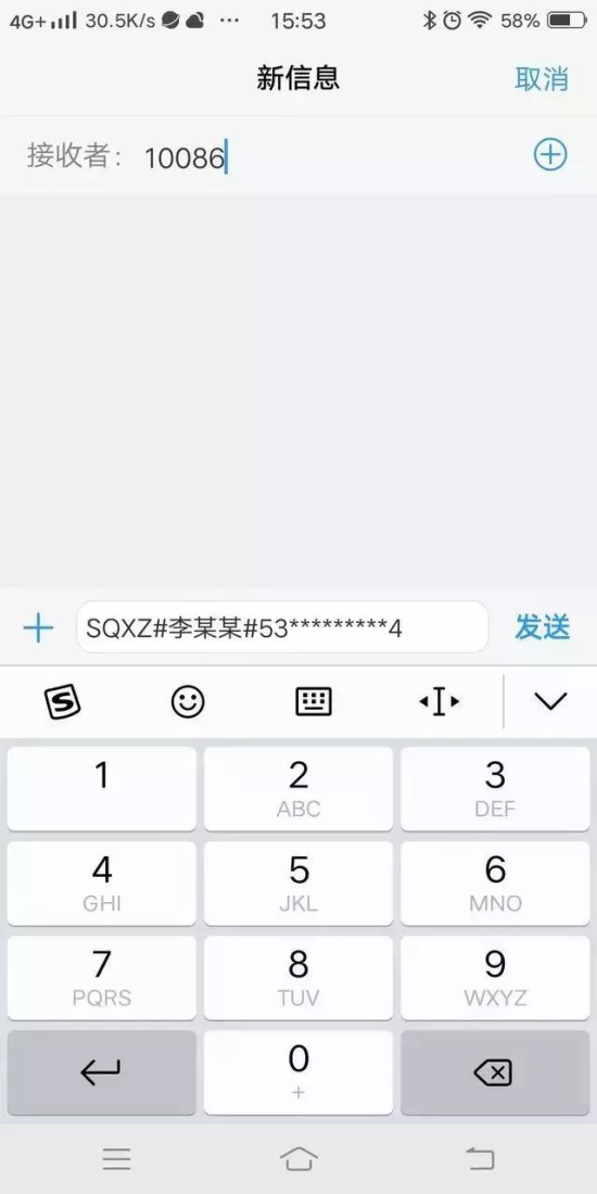 用戶通過短信申請授權(quán)碼(短信指令:SQXZ#用戶名#證件號碼,發(fā)送至歸屬運(yùn)營商,移動10086,聯(lián)通10010,電信10001)如圖所示: