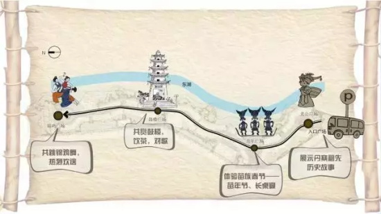 為了給游客更深入的文化體驗,經過設計者的精心打磨,小鎮的游覽線路可以通過4個極具苗族特色的文化廣場串聯起來。