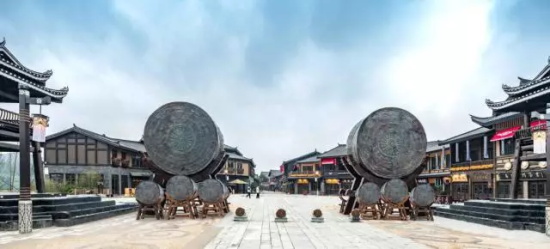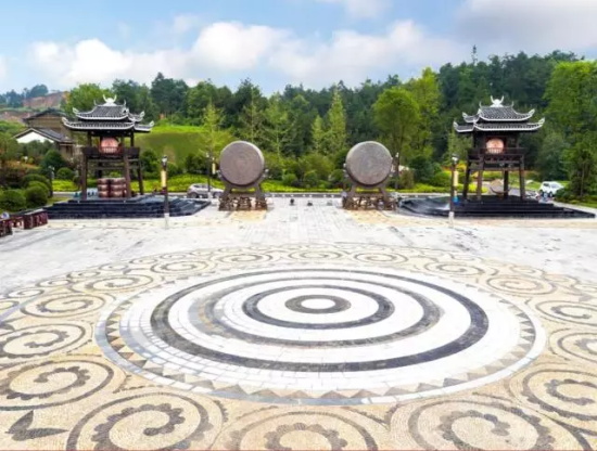 尤公廣場呈圓形設計,面積2000平米。它最大的設計亮點除了3層的吊腳牌樓,就是廣場的地面鋪裝,鋪裝紋樣采用了苗族特色的銅鼓紋樣,圖案深色的地方采用了當地古老的青磚,并搭配深淺不同的鵝卵石。