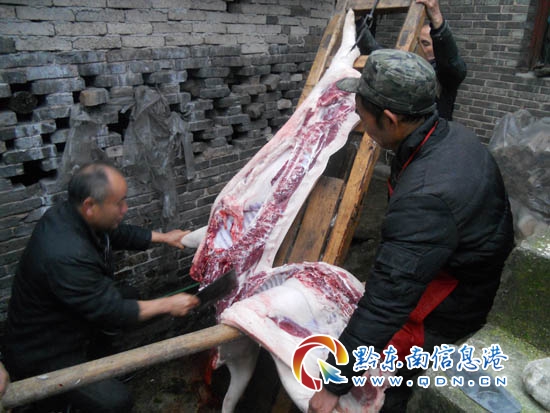 本網訊 1月14日,黃平縣舊州鎮貧困戶吳老貴家殺年豬了。前來幫忙的鄉親們,男的忙著抬殺櫈、磨刀、備好接血盆;女的忙著討菜、洗菜、燒水、煮飯,十分熱鬧。