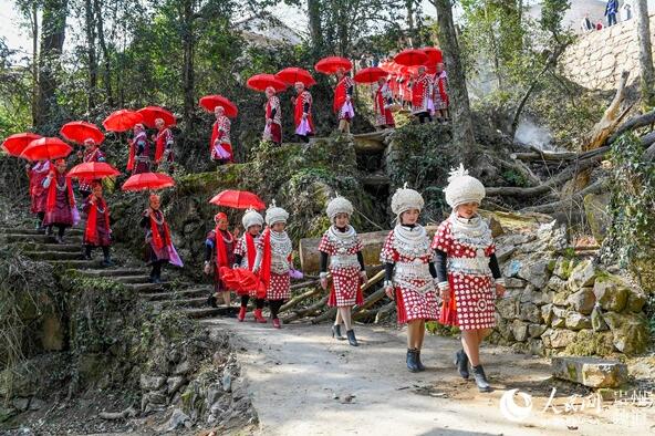 2月17日,是農歷大年初二,貴州省黃平縣谷隴項格村80名姑媽挑著禮物熱熱鬧鬧回家過大年。