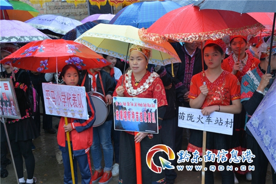 煙雨朦朧的活動現場中,排列整齊的12排苗族蘆笙熱烈吹奏,旌旗舞動,笙歌不斷;20余個參賽文藝隊伍齊聚會場唱歌跳舞,臺下觀眾人頭攢動,歌聲、蘆笙聲、喝彩聲把喜慶熱鬧的會場一度推向了高潮。(楊政欣)