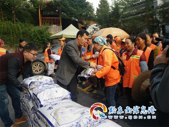 環衛工人潘禮英笑著說:“今天開的會讓我更加明白了我們環衛工工作的重要性,謝謝領導關心我們,還給我們發放獎金和大米,我們很開心。”(黃平縣城市管理行政綜合執法局)