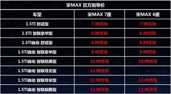 宋MAX 6座延續(xù)“大美”產(chǎn)品實力,由國際大師攜手打造,帶來星級輕奢體驗。同時,為滿足更多消費需求,7座版同步新增2款高配車型。幸福不止于此,現(xiàn)在購宋MAX全系車型還可享“5重星級禮遇”,誠意滿滿!