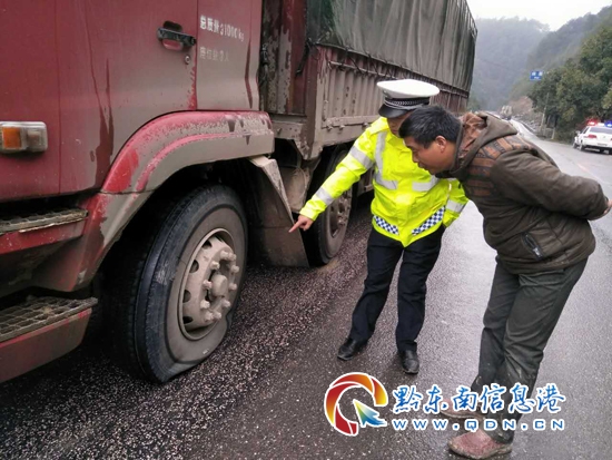本網訊 2018年1月4日14時55分,劍河縣公安局交警大隊農村片區三中隊在320國道1847KM+10M處(麻粟路段)執勤查車,這時一輛大貨車向交警查車點駛來,交警示意其靠邊停車,接受例行檢查,當執勤民警對車輛進行例行檢查時,發現該車前輪輪胎出現爆胎,導致整個車身傾斜不平,如果繼續行駛,將會出現重大的道路交通安全隱患。