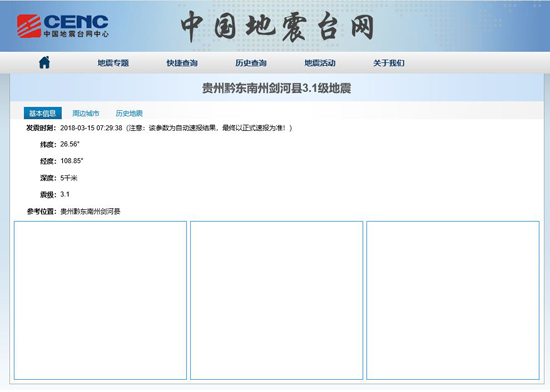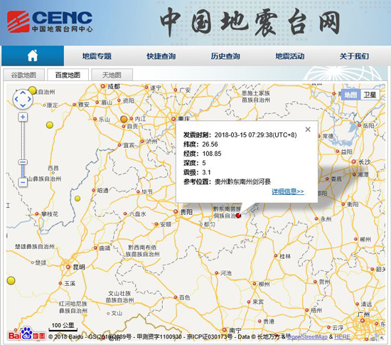 中國地震臺網正式測定:3月15日07時29分在貴州黔東南州劍河縣(北緯26.59度,東經108.86度)發生3.2級地震,震源深度6千米,地點處于劍河縣南加鎮一帶。此次地震屬微震,目前尚無人員傷亡和財產損失報告。(吳蔚)